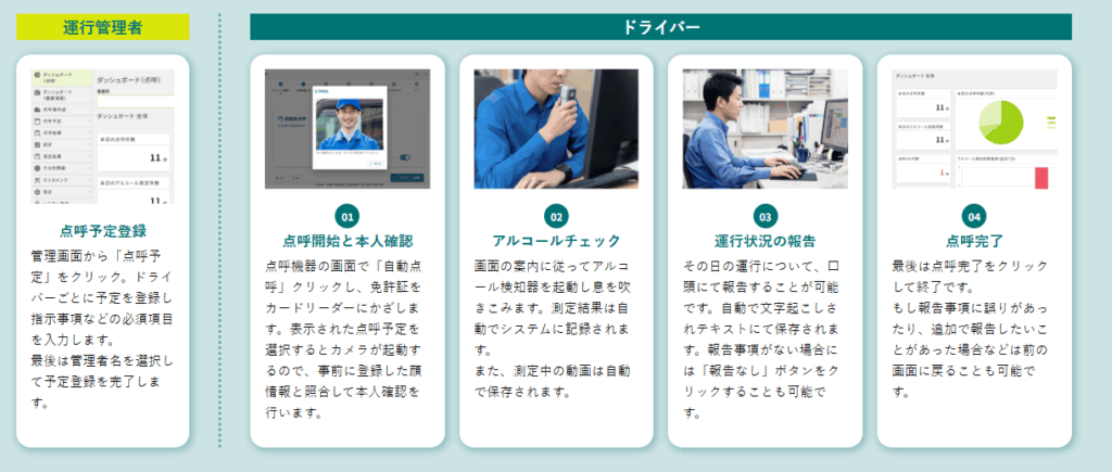 具体的には、ドライバー(運転手)に対し運行前に義務付けられている体調、飲酒の確認などの各種点呼をパソコン上でインターネットを用いて遠隔で測定して、パソコンのモニター画面を通して点呼者と運転者が対面で点呼を行います。