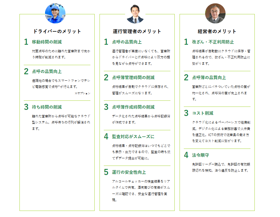 その結果、遠くにいるドライバーとでも顔を見ながら点呼を行うことができます。また顔が見れる事により、ドライバーの体調も同時に確認することができます。