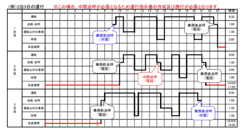 ドライバーが遠隔地で乗務を開始・終了する場合は、電話点呼またはその他の方法により乗務前・乗務後点呼を実施しますが、IT点呼は改善基準で定められている休息期間(連続8時間以上または、分割休息にて10時間以上)の前後に実施しなければなりません。