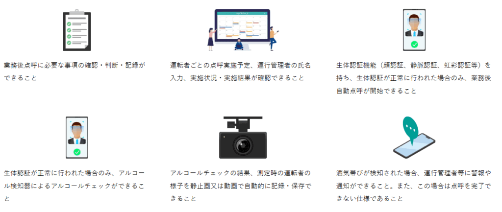 業務後自動点呼に使用する機器の要件は、主に「機能」と「体制」の2つがあります。