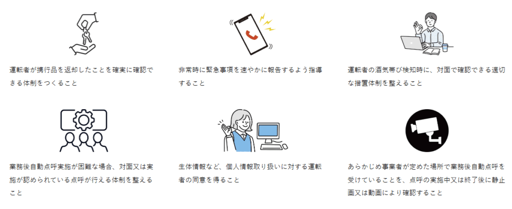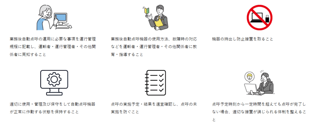 業務後自動点呼を運用するうえで遵守すべき事項は以下のとおりです。